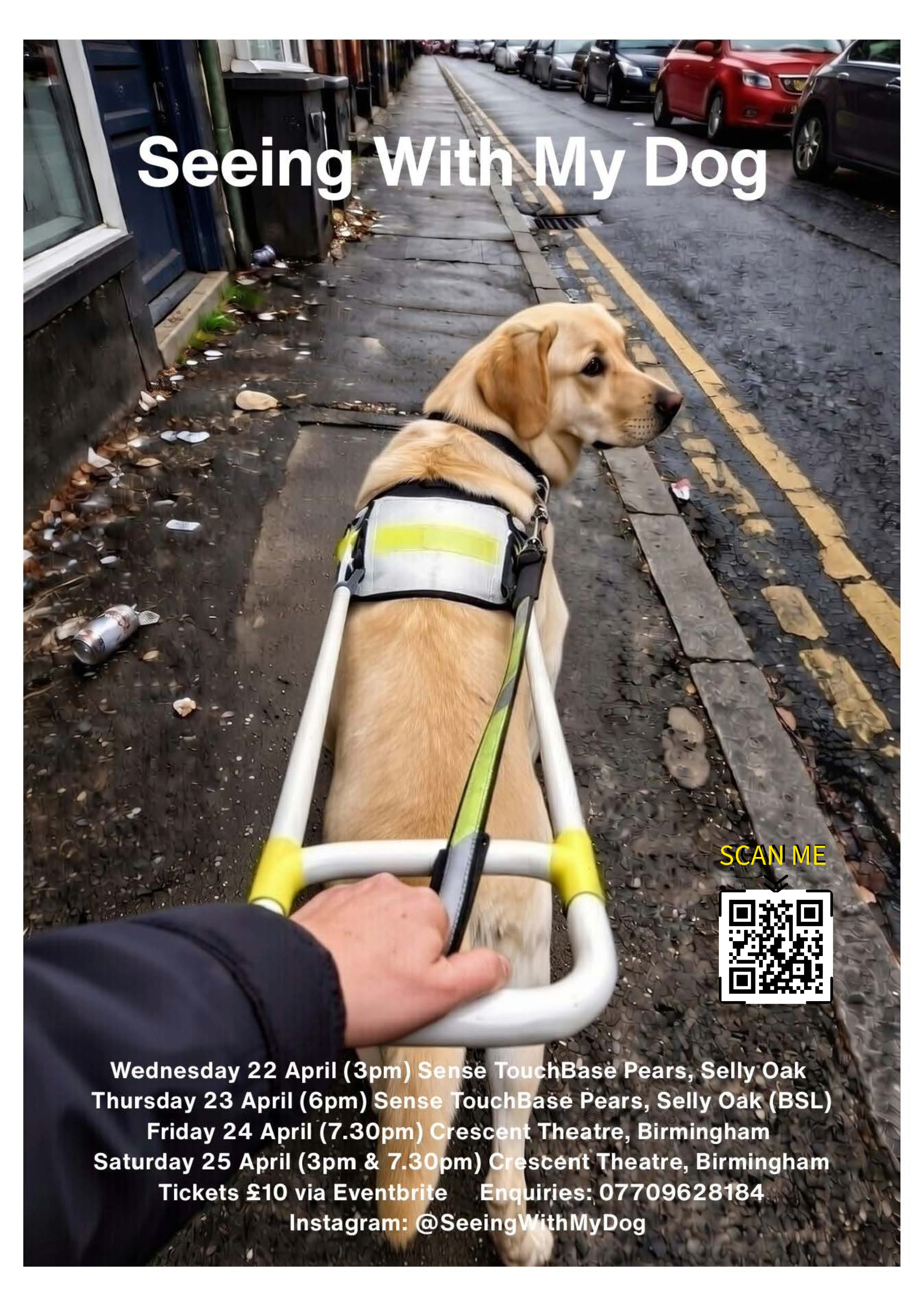 Seeing with my dog will be presented in Birmingham and Leamington in March 2026. There will be four actors, two of whom will be vision impaired. Although the play is serious in its themes, it is hilarious in its performance. For instance, the long suffering guide dog, Dixon, explains how his partner (the Protagonist) keeps getting left and right mixed up. Moreover, Dixon holds regular Zoom conferences with his guide dog companion. They share experiences like how their partners frequently forget to take treats, the nuisances of cars parked on pavements, how best to get onto a settee while distracting their partner, and the threat to their working lives of AI.